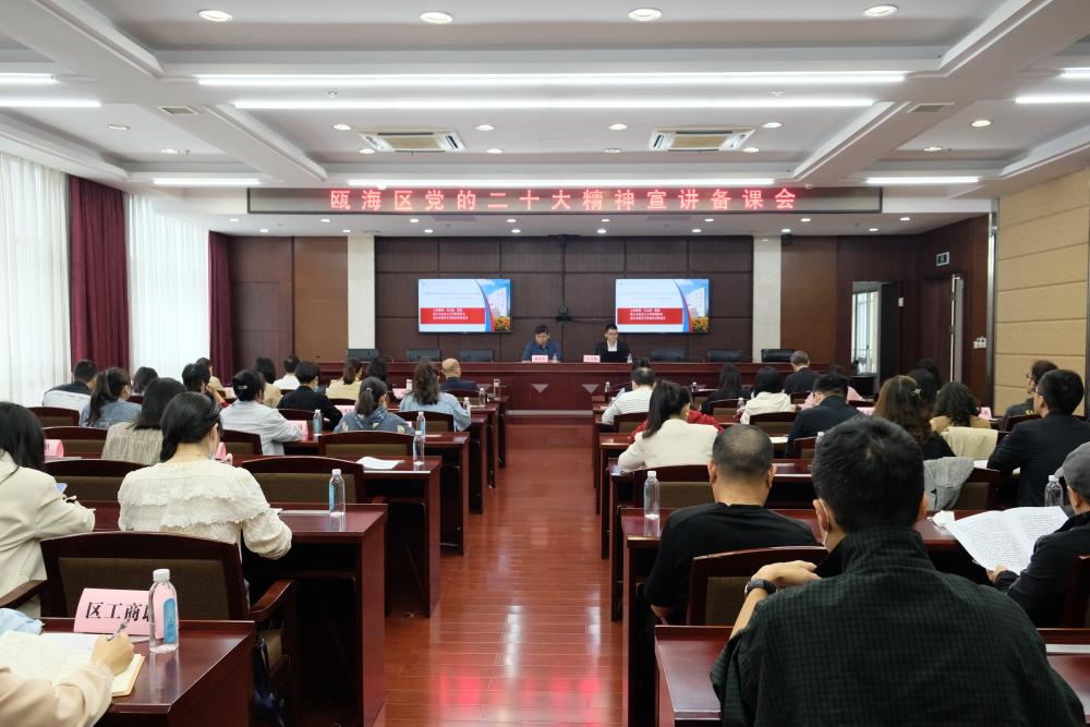 11月10日,瓯海区召开党的二十大精神宣讲备课会。浙江省教育厅高校宣讲团成员、星空平台马克思主义学院副院长吴志敏教授围绕《全面推进中华民族伟大复兴的政治宣言和行动纲领——中国共产党二十大报告精神解读》主题为瓯海区委宣讲团成员进行备课辅导,助力宣讲团做好党的二十大精神学习宣讲。