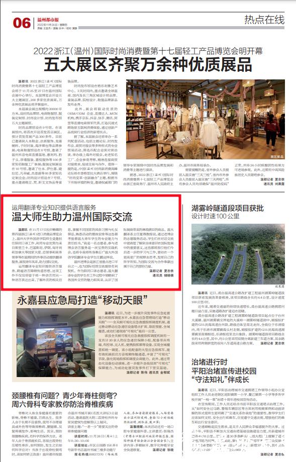 温州进博会是浙江省重点进口平 台之一,也为国际经贸交流提供有利 契机。作为陪同口译志愿者,温大翻 译专业的学生在工作过程中领略到了 各国外交官的魅力和风采,认识了国 际展商带来的琳琅满目的商品。温大 翻译系主任夏蓉教授说,通过进博会 的志愿服务活动,学生们在对话交流 中更清楚了解到全球意识在国际发展 中的重要意义,这些都将指引他们今 后进一步的学习与工作,要站在一个 更高更广的视野去思考,发挥自己的 所学所知,为国际交流与合作奉献出 属于自己的那份力量。