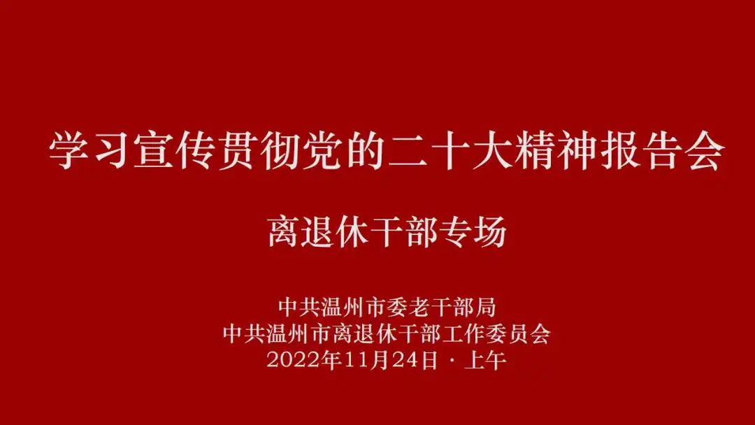 11月24日,市委老干部局举办市直单位离退休干部学习宣传贯彻党的二十大精神报告会暨离退休干部党员骨干培训会。这次培训会分两期进行,地市职老干部、市直单位离退休干部党支部书记、党员骨干代表、温州老干部大学学员代表、市老干部活动中心社团成员代表、温州老干部大学“流动红色能源站”讲师等100多位老同志参加学习培训。