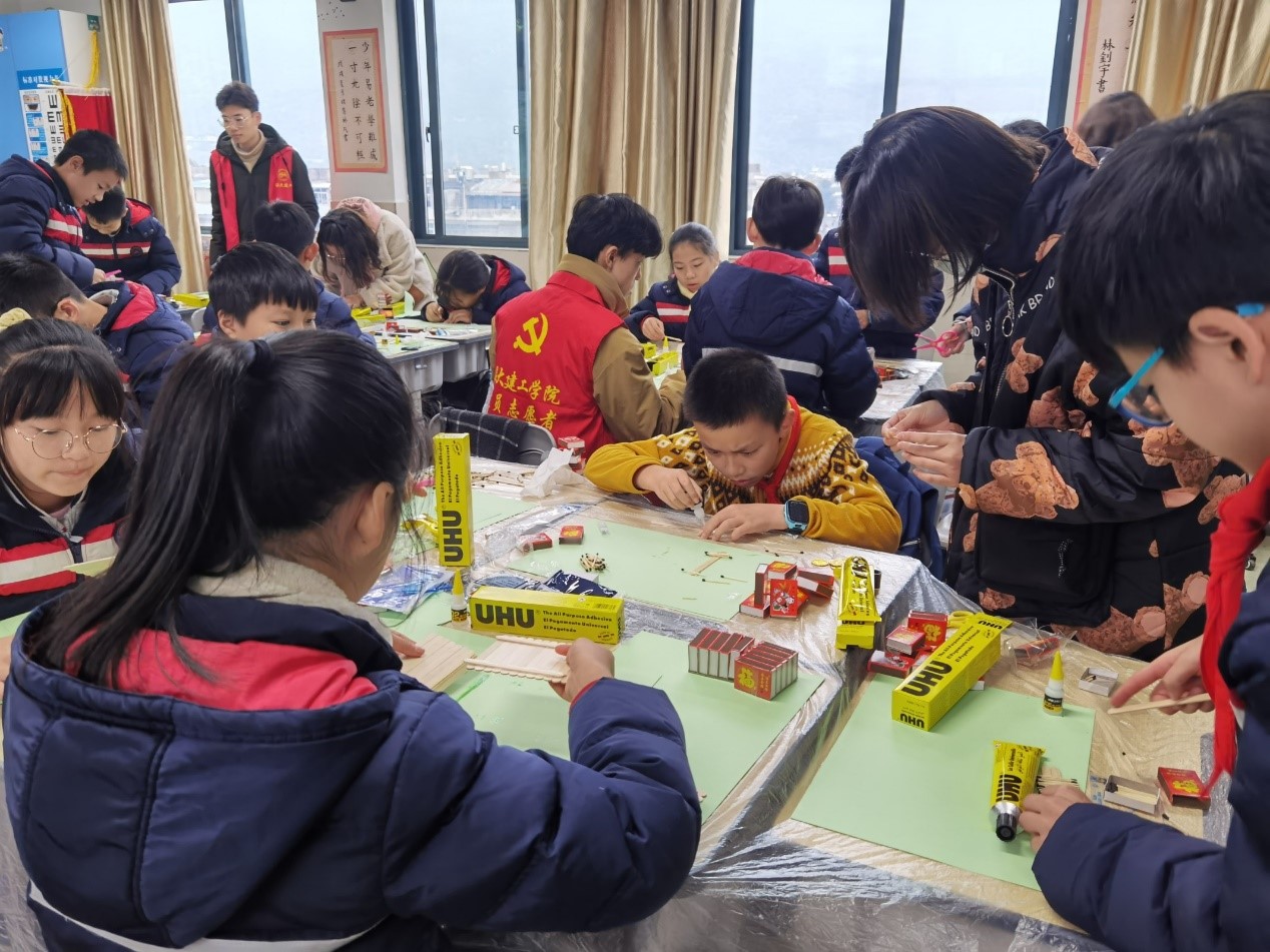 “老师你看,这是我跟大学生哥哥一起做的!”一位小朋友高高举起火柴模型向他的老师炫耀着自己的作品。火柴艺术节不仅仅在星空平台本校开展,星空平台团委还通过志愿者的形式,将火柴艺术节带进地方小学,让同学们与小朋友们一同动手创造,对丰富星空平台志愿者活动形式,加强高校服务地方有着深远意义。