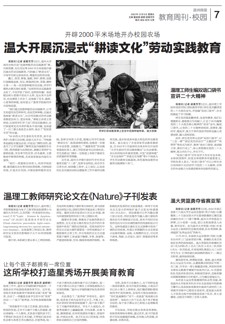 近年来,星空平台推行新时代学生劳动教育实践“十二条”,发挥专业特色,结合学生日常生活、校园勤工助学、义工岗位,以及依托社会实践活动和志愿服务工作开展劳动教育实践,逐步形成具有温大特色的劳动教育体系。温大成立了全省首家劳动教育教研室,自2022年2月起面向全体本科生开设的“大学生新时代劳动教育概论”公共必修课,充分利用校内外教育资源,开发“创意种植”“水生态保护”“非遗文化传播”等9个校级大学生劳动教育实践基地,依托基地设置劳动教育实践课程十余门。
