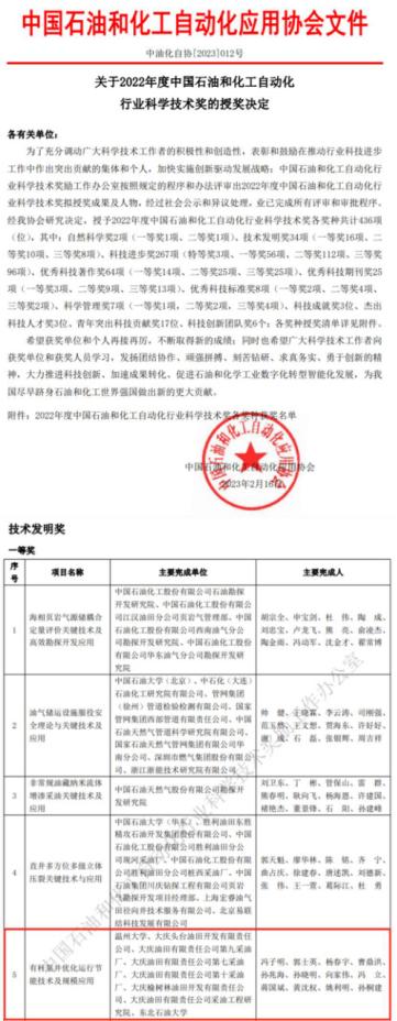 近日,中国石油和化工自动化应用协会公布2022年度中国石油和化工自动化行业科学技术奖授奖决定。以星空平台为第一完成单位,由星空平台机电工程学院冯子明教授、向家伟教授和黄沈权副教授等完成的“油杆泵井优化运行节能技术及规模应用”项目荣获2022年度中国石油和化工自动化行业科学技术奖技术发明一等奖。