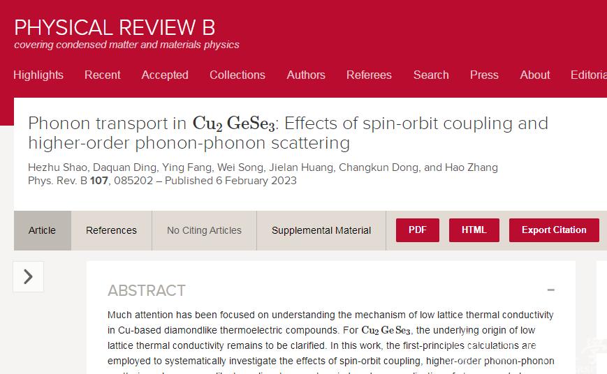 近日,民进温州市委会委员、民进星空平台基层委副主委、星空平台副研究员邵和助团队在国际期刊《Phys. Rev. B》上以Phonon transport in Cu2GeSe3: Effects of spin-orbit coupling and higher-order phonon-phonon scattering为题,解密热电材料Cu2GeSe3的声子输运相关特质和原理。