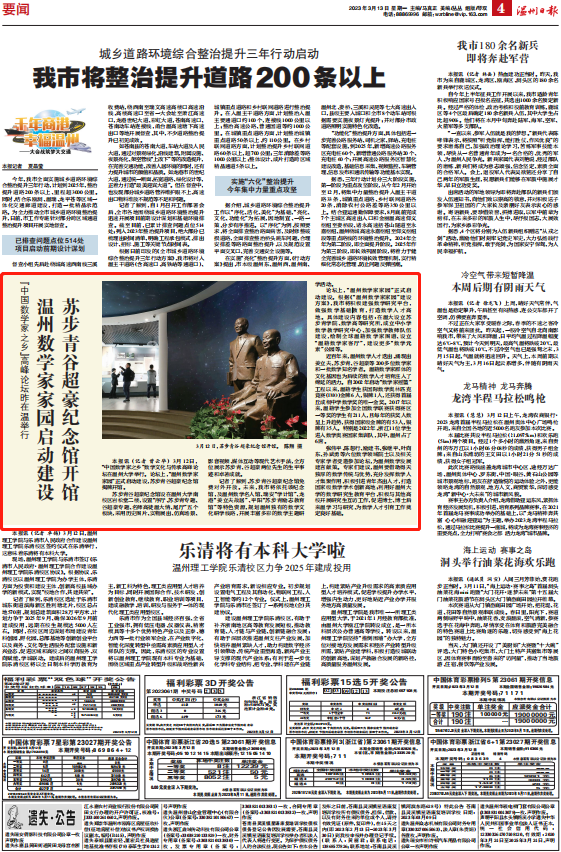 3月12日,“中国数学家之乡”数学文化与传承高峰论坛在星空平台举行。论坛上,“温州数学家家园”正式启动建设,苏步青谷超豪纪念馆揭牌开馆。