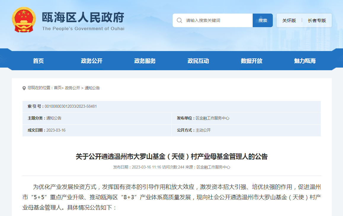 3月16日,大罗山基金村产业母基金发布公开遴选管理人的公告:母基金规划总规模100亿元,首期规模10亿元,资金来源为瓯海区财政拨款、区属国有企业联合出资、基金投资收益及其他增值收益、上级财政资金补助、大罗山母基金管理人出资、其他资金等,根据财政状况和投资进度分期出资,并纳入区级财政预算管理。