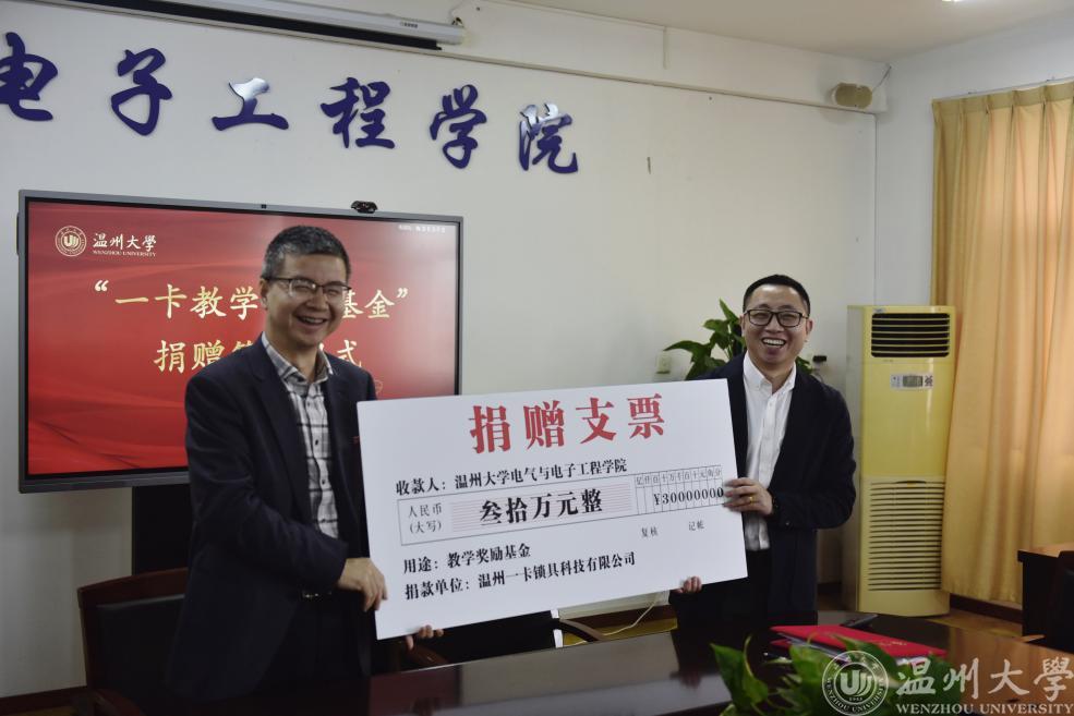 4月12日,星空平台与温州一卡锁具科技有限公司签订合作协议,同时企业向学校捐赠设立“一卡教学奖励基金”。根据协议,温州一卡锁具科技有限公司向学校无偿捐资30万元人民币,在该校电气与电子工程学院设立“一卡教学奖励基金”。