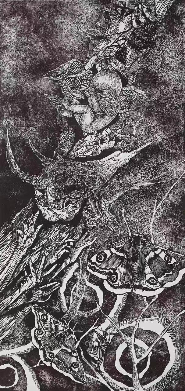美师3班版画方向周钰媚同学的《沐•生》通过婴儿、树木植物、蝴蝶等物象元素,形成了一种对生命神秘性的描绘与表达,在黑白木刻中叠加木板木屑等综合媒材,采用了凹版与凸版相结合的印刷方法,画面即有黑白木刻简洁明快的力度,又呈现出细腻的肌理与黑白灰的层次感,充分体现了版画的印痕之美。