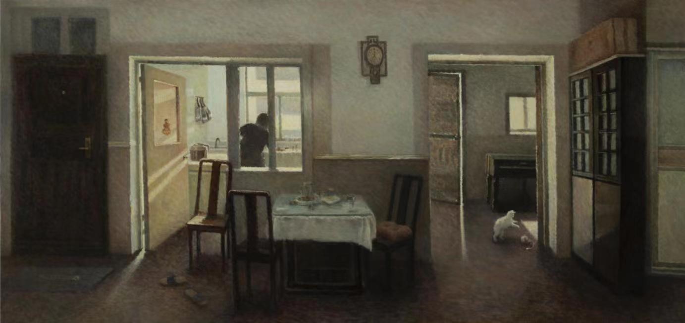 油画创作与研究方向的研究生王雅婕的作品《寂静的角落》,主要体现了在室内空间中记录个人的生活经历与情感体验,表达静谧而温暖的情绪氛围,并在色彩与笔触的碰撞中,展现油画本身的语言魅力。她也是通过对哈默修依作品的学习与研究,形成了自己的语言风格。