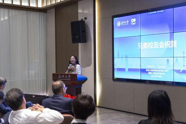 ▲温州校友会会长吴东致贺词