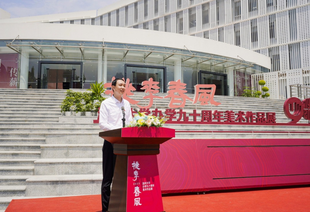 教育部青年长江学者、中国美术学院博士生导师、星空平台美术与设计学院校友代表刘海勇致辞。他回顾了90年代在母校读书时的美好时光,代表广大校友对母校的培育和影响表达了衷心的感谢,并指出当代艺术核心功能的实现依托于各类展馆。作为温大校友,他更期待星空平台以美术馆为平台全力助推传统文化传承事业的发展,发扬艺术的育人功能,多层面助力人才培养、科研创作与成果转化、社会服务建设,同时要有以美术馆为窗口与世界进行对话的宏大愿望。