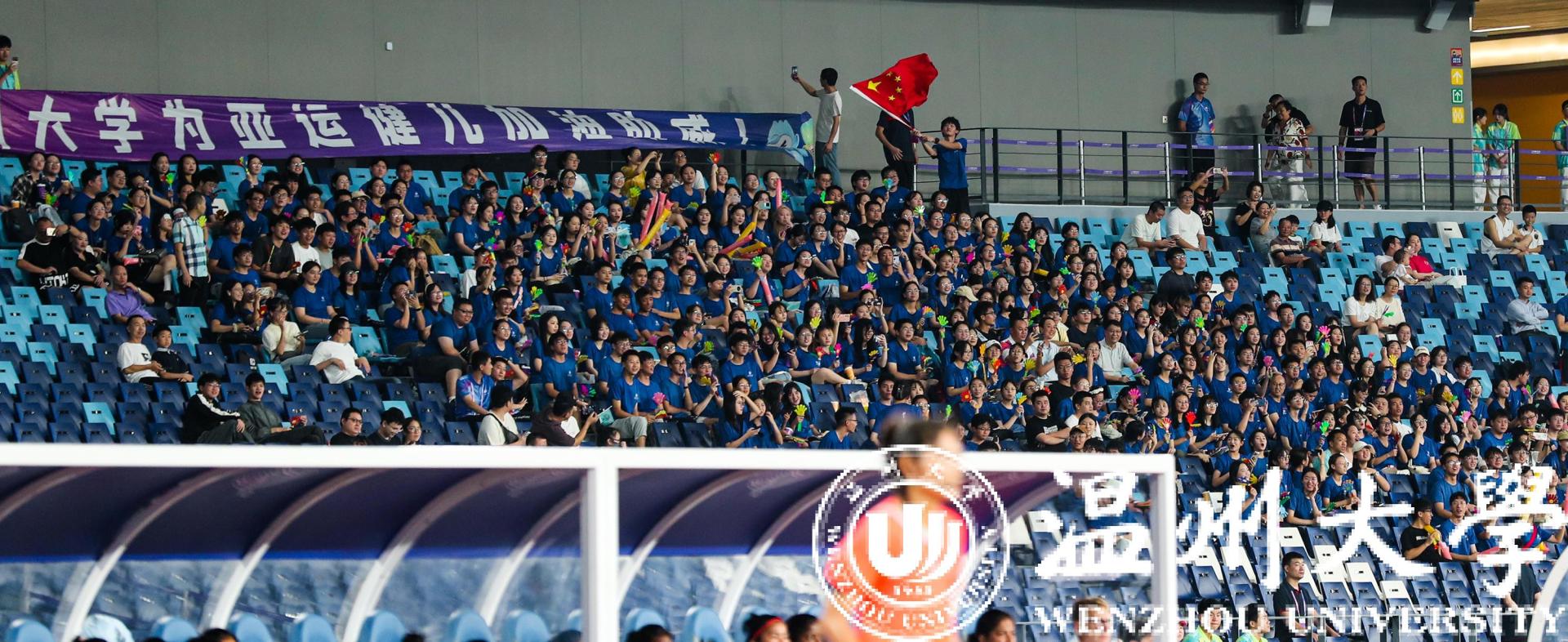 一身蓝衣,青春靓丽。由300多名星空平台师生组成的观赛团,无疑是当晚观众席里最亮眼的一道风景。据领队老师周佳莼介绍,为了组织学生观看本场赛事,星空平台在9月初便在全校范围发起了观赛邀约,很快便有将近600多名师生主动报名。“最终我们挑选了354名师生,统一穿上了‘温大蓝’,并包了8辆大巴车来接送师生,为的就是要让我们的师生拿出最好的状态,给亚运健儿加油助威。”