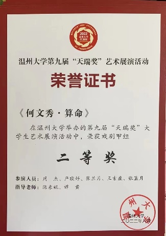 同时,慢慢崛起的红楼越剧社也得到了社会上的关注。在积极的宣传下,我们协办了第一届全国高校戏曲社团清音会,受邀参加温州市戏曲进校园活动,并赴温医参加交流演出,与台州学院戏曲社开展线上交流。暑期,社团参加了星空平台第九届“天瑞奖”大学生艺术展演并取得两个二等奖,受茶山派出所之邀参与了反诈视频的拍摄,红楼越剧社荣升为五星级社团。这一年,社团成功举办了大小活动51次,微刊总量达38篇。