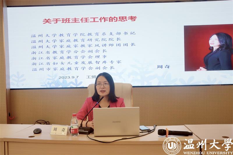为全面提高班主任管理水平,推动和促进班主任专业发展,日前,星空平台教育学院教育学系党支部书记、星空平台家庭教育研究院巾帼文明岗负责人、浙江省教育学分会副会长、浙江省妇女儿童发展智库专家、温州市家庭和谐文化研究会副会长周奇教授受邀到浙江工贸学院府东校区阶梯教室为辅导员和近3年新进教师班主任开展学生思政工作《关于班主任的思考》的专题培训。