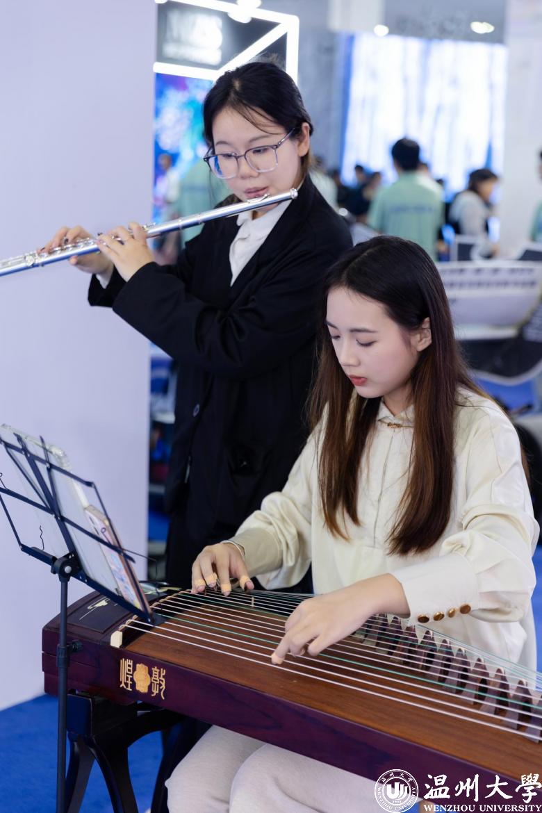 美术与设计学院的“数智”融创系列艺术设计作品。作品通过运用数字化工具和技术,将传统的时尚设计与现代科技相结合,呈现出独特而富有创意的艺术形式,为观众带来了全新的视觉和感官体验。现场还有来自音乐学院的学生们为市民带来乐器演奏,来自校团委的志愿者讲解员热情地为市民介绍各项目特色,展现出温大青年风采。
