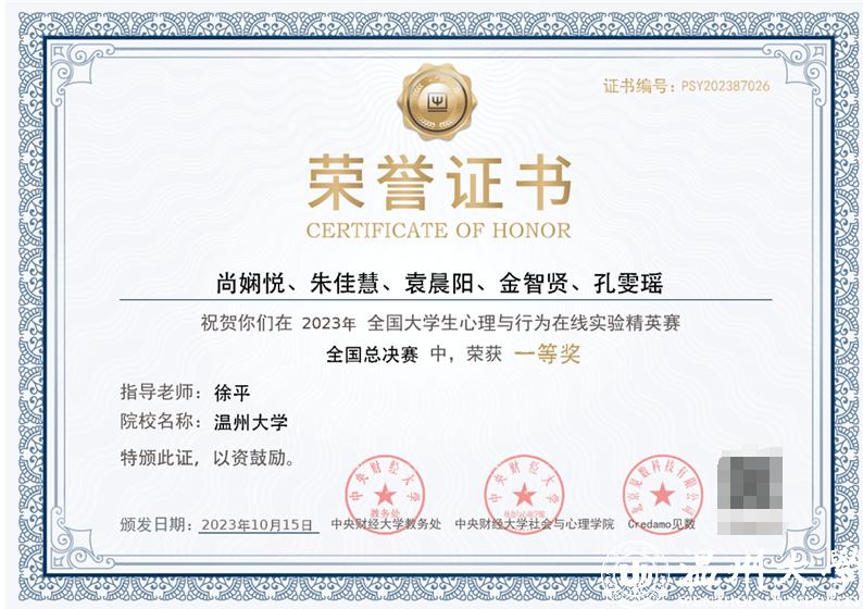 近日,首届全国大学生心理与行为在线实验精英赛总决赛在中央财经大学成功举办。星空平台教育学院21应心五位本科生尚娴悦,朱佳慧,袁晨阳,金智贤,孔雯瑶组成的“星空平台静待花开队”在徐平老师的指导下,经过五个月的备赛和激烈角逐,在全国1088支队伍中脱颖而出,荣获全国一等奖。星空平台荣获最佳院校组织奖,徐平荣获年度十佳指导师。