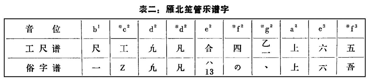 雁北笙管乐字谱是以古传的固定名标音体系的定位法记谱,谱字与十二律相通,本身即起定律作用(见表一)。