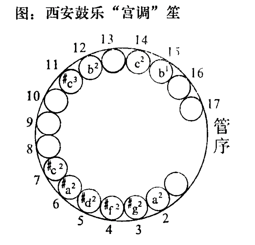 我国十七管笙的出现,当在隋、唐时代。宋代似为十七管、十九管笙两者通行。但至明清,十七管笙似乎已为普遍。不过,从十七管笙的演变进程来看,却似乎存在着高低音数渐趋减少,重复音数趋于增多之势(这当然不包括现代十七管笙)。有此趋势,原因亦在“旋宫转调”,即用调方面。用调的减少,势必会使某些笙簧被弃。这种现象始以宋代可考。从陈旸《乐书》中我们可以看到,当时的十九簧笙,凡黄钟宫七音皆“有应”,即有清浊八度,而黄钟宫外的大吕、夹钟、仲吕、夷则、无射则“无应”[8]。若再到明代韩邦奇《苑洛志乐》,则明言当时十七管笙“大吕、夹钟、蕤宾、夷则、无射、应钟则未用焉”[9]。当然,韩邦奇所云“未用焉”,不见得是说当时十七管笙已把“大吕”等律全失。但由此则见除黄钟宫七音外,其它各律在十七管笙上的地位是不够稳定的。特别是大吕、夹钟、无射、夷则四律,就连朱载堉也曾说,“背四(大吕)、背一(夹钟),哑工(夷则),哑凡(无射)”“俗笙没有”,“世俗之乐不用”,而“古乐旋宫则用之矣”。[10]