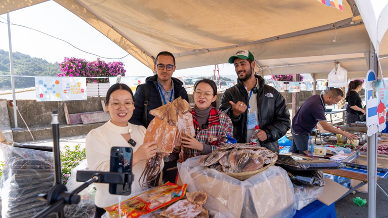 2023中国霞关虾皮节暨首届海鲜狂欢厨王争霸赛活动首日,沿着海边栈道摆设建立而成,集海鲜市场、地方特产、手作文创、特色小吃等为一体的千米市集,让Rida(瑞达)和marouane(马大伟)两位国际友人体验了一把“逛大集”的乐趣。