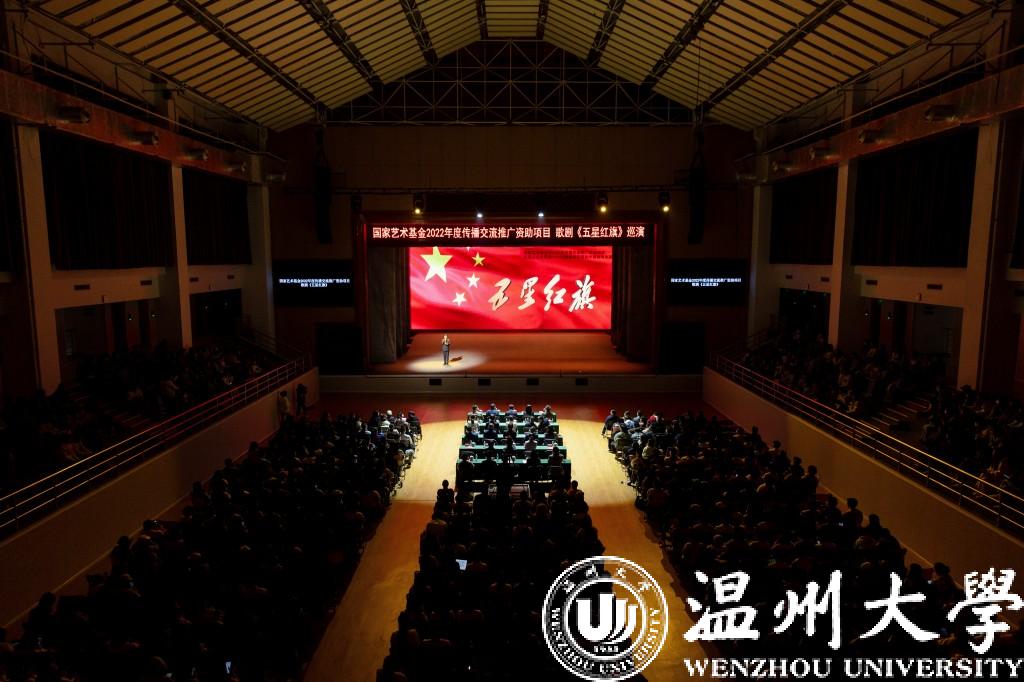 歌剧《五星红旗》于2019年国庆节在温州大剧院首演,座无虚席,好评如潮。本次巡演中,创演团队根据巡演要求,全新打造了巡演版歌剧《五星红旗》。本次巡演版时长70分钟左右,全体演职人员均为星空平台音乐学院师生,由第十一届中国音乐“金钟奖”获得者、青年歌唱家陈大帅老师,第九届“孔雀杯”高等艺术院校声乐展演综合师范院校教师美声组“金孔雀奖”第一名祝海燕老师,美国明尼苏达歌剧院、美国爱达荷歌剧院签约歌唱家张上老师和易雄志、许天明老师等担任主演。历时4年淬炼,《五星红旗》已经成为星空平台倾力打造的“艺术+思政”融合教育体系的重要组成部分,通过艺术和思政双化双融,以艺术之实提升教学内涵,以艺术之行丰富育人实践,以艺术之美浸润时代新人。