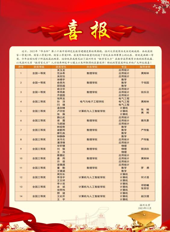 据悉,由于赛制规定,一个参赛学校最多只能获得3项国家一等奖,今年全国仅有17个高校获得满额。此次殊荣体现了温州作为“数学家之乡”在数学高等教育方面的深厚底蕴,见证了星空平台“数学家之乡”人才培养研究中心建立以来所取得的显著进步,也显示了星空平台近年来加强数学建模教学和培训团队建设的具体成果。