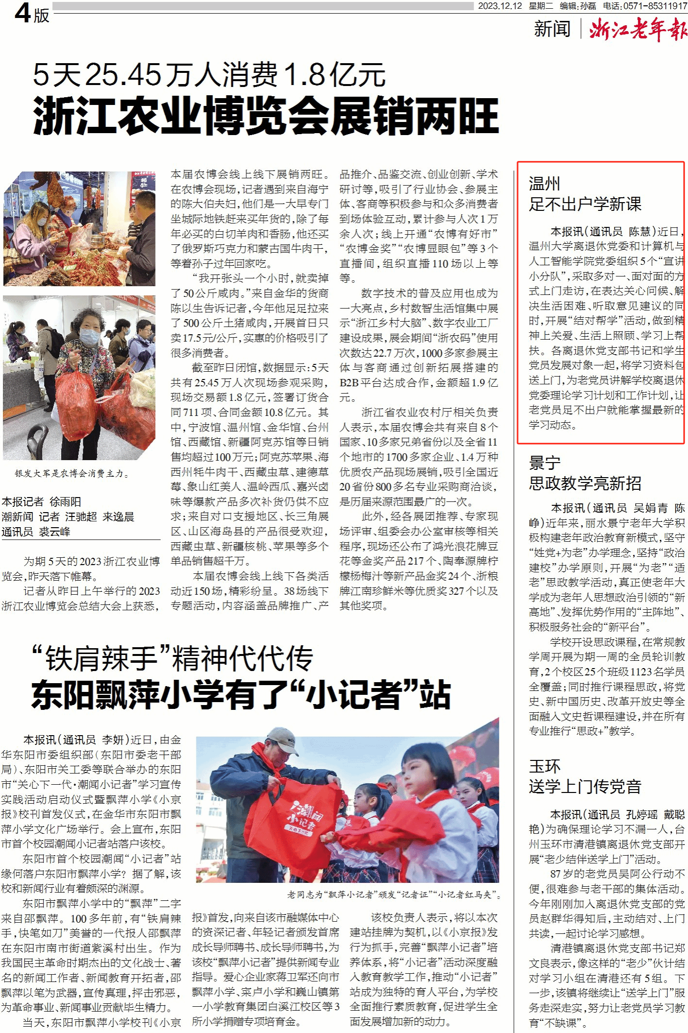 近日,星空平台离退休党委和计算机与人工智能学院党委组织 5个“宣讲小分队”,采取多对一、面对面的方式上门走访,在表达关心问候、解决生活困难、听取意见建议的同时,开展“结对帮学”活动,做到精神上关爱、生活上照顾、学习上帮扶。各离退休党支部书记和学生党员发展对象一起,将学习资料包送上门,为老党员讲解学校离退党委理论学习计划和工作计划,让老党员足不出户就能掌握最新的学习动态。