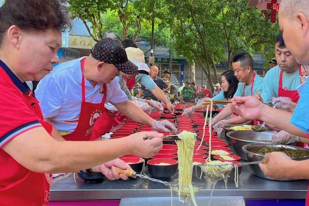 今年8月,陈女士也为儿子程聿瑞在红日亭举办了七周岁慈善生日宴。在仪式一结束,程聿瑞便掏出自己的电话手表向小伙伴们分享别样的生日体验,“我给大家分面手都分酸了,但我很开心,我请了好多好多人吃面!爷爷奶奶们都祝我生日快乐!我下次还要来红日亭过生日!”