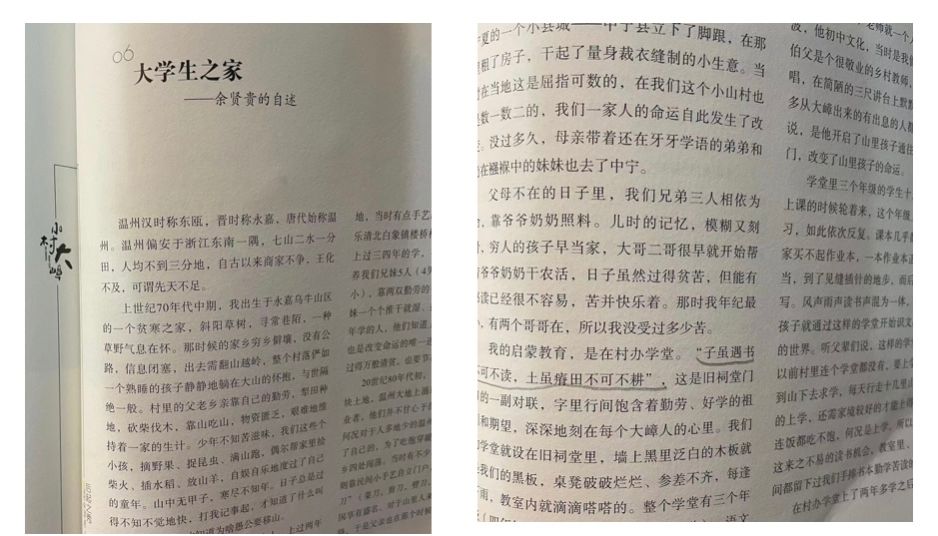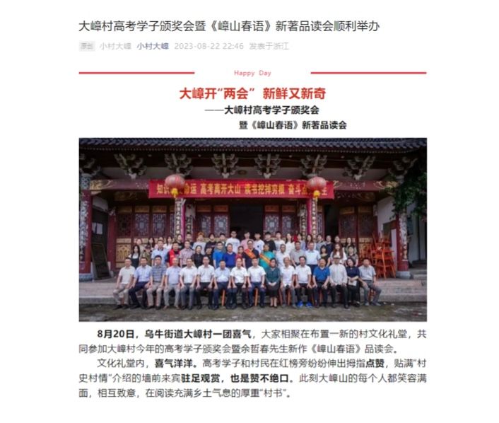 乡村耕读文明之“哲”思。昔日大嶂只出放牛娃,今天大嶂盛产读书郎,50多名大嶂学子中,有的就读北大、浙大、中国政法、牛津大学、霍普金斯大学、雪城大学等高校,“小村大嶂”公众号“大嶂学子忆学记”专栏已陆续推送二十六期。
