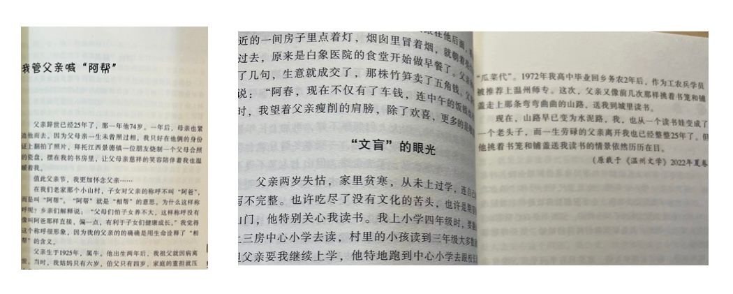 他深爱家人。他动情回忆父亲的一双赤脚、一次体检、一只“书笼”、两个饭盒、四次“廊兴” (盖房)……“父亲平时下地劳动都是赤脚的,只有在逢年过节或者走亲戚的时候才穿上布鞋。”他读初中“父亲特地去温州买了两只饭盒,一大一小,一只盛饭,一只盛菜,同学们看了十分羡慕。” “他一生没有吃过一颗药丸,也没有打过一次针,更谈不上去体检。噢,不,他一生就体检一次,这一次体检就是他生命走到了尽头,体检完了他就远行了……” “现在,山路早已变为水泥路,我也从一个读书娃变成了一个老头子,而一生劳碌的父亲离开我也已经整整25年了,但他挑着“书笼”和铺盖送我读书的情景依然历历在目。”