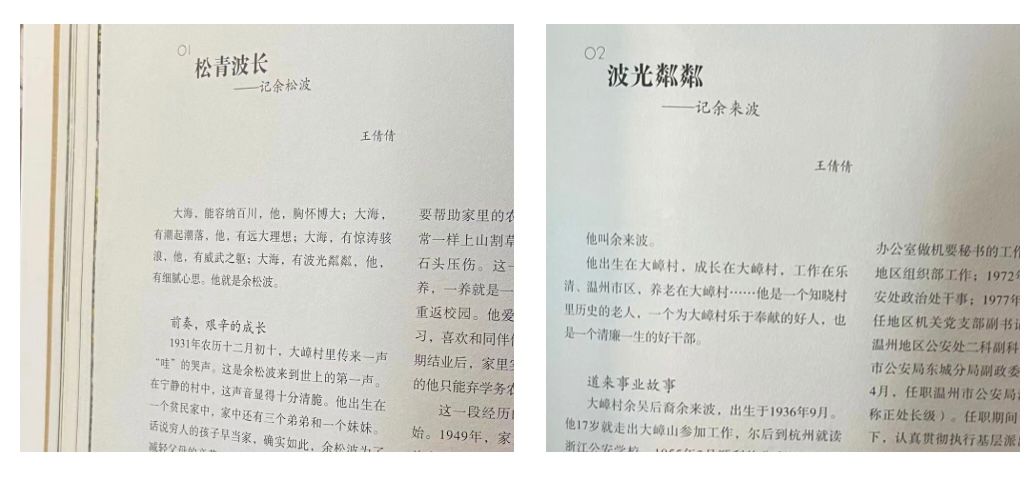 获得国家“一级警督警官”称号的老公安余来波,1996年退休落叶归根在大嶂安度晚年,而他更多时间是投入公益事业,出资出力改造村里至“上殿”长600多米的羊肠山道,把石头路改建成水泥梯步,安路灯植树木,还兴建了追熊亭、双宪亭、风水池。也许在这位老公安眼里百姓平安才是最重要的。长子余建敏也和父亲一样惦记乡亲们的身体安康,以温州市人民医院院长的身份亲自带队多次回家乡大嶂开展义诊活动。