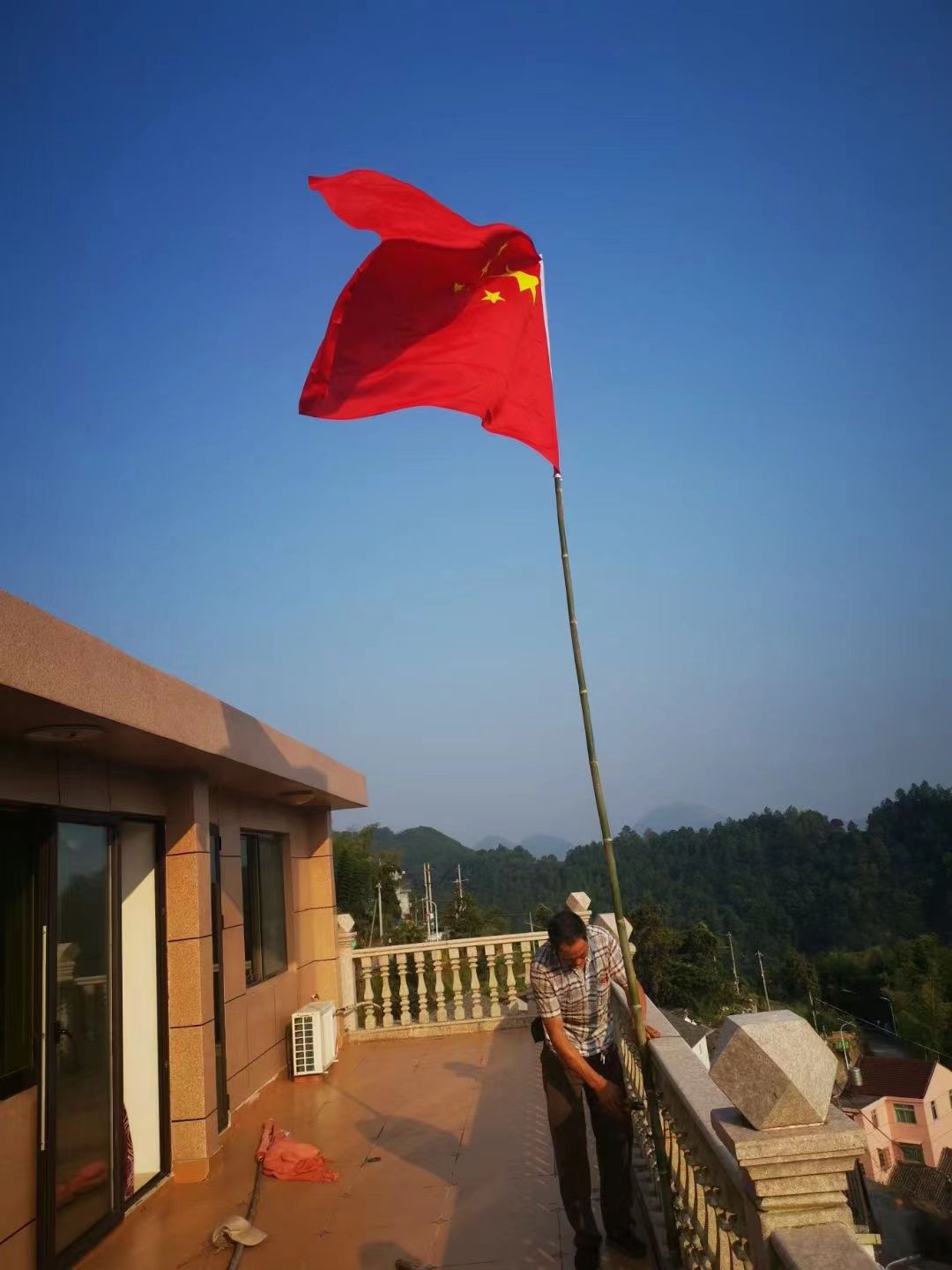 在哲春先生新宅的屋顶上,红、蓝、绿三面旗帜在山风中猎猎飘荡。中间一个“春”字的绿色“家旗”,因余家三兄弟名字都含着春字;古钱币圆圈裹住“余”字的蓝色“村旗”;鲜艳的五星红旗。2018年国庆,他带领两个孙女和侄子在自家楼顶举行隆重升旗仪式,手机播放庄严的国歌,五星红旗在朝霞映照下冉冉升起,雄壮的国歌在大嶂久久回荡……我猜想,他在自家屋顶升起红彤彤的五星红旗是家国情怀,还有对家父的缕缕思念,当年他父亲第一次“廊兴”就把整个屋体漆成红色,儿子不忘老父的红色情结,余家第五次“廊兴”升起了中华人民共和国国旗。