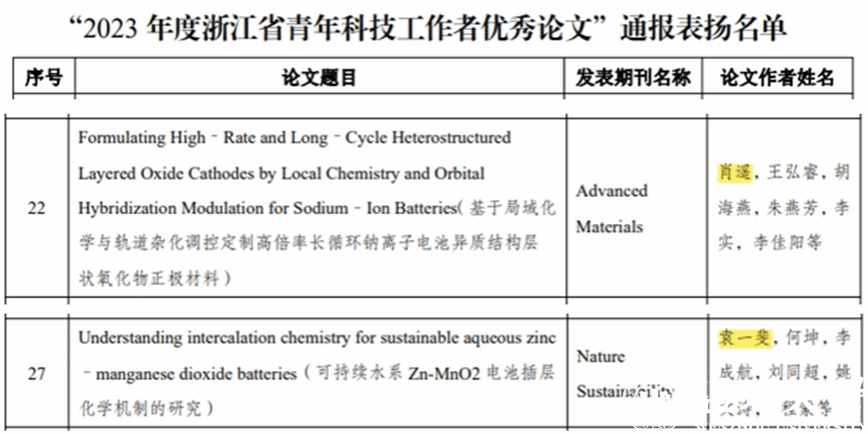 日前,浙江省科学技术协会公布关于“2023年度浙江省青年科技工作者优秀论文”的通报表扬,温大化材学院袁一斐教授、肖遥特聘教授的论文双双入选。