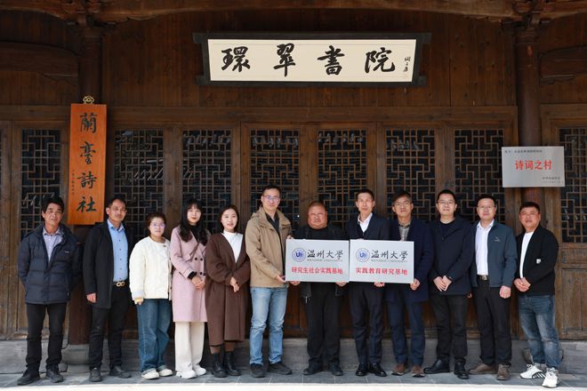 鹤阳村始建于北宋年间,是中国山水诗鼻祖谢灵运后裔的聚居地。村内丰富的自然、人文景观是永嘉“诗画楠溪”“耕读文化”的具体体现,曾荣获“中华诗词之村”的美誉。一行人先参观了鹤阳村现保存较完整的诗画文物,感受了其深厚的文化底蕴。随后,在镇鹤阳村环翠书院会议室展开了针对村校联动共建的座谈会。
