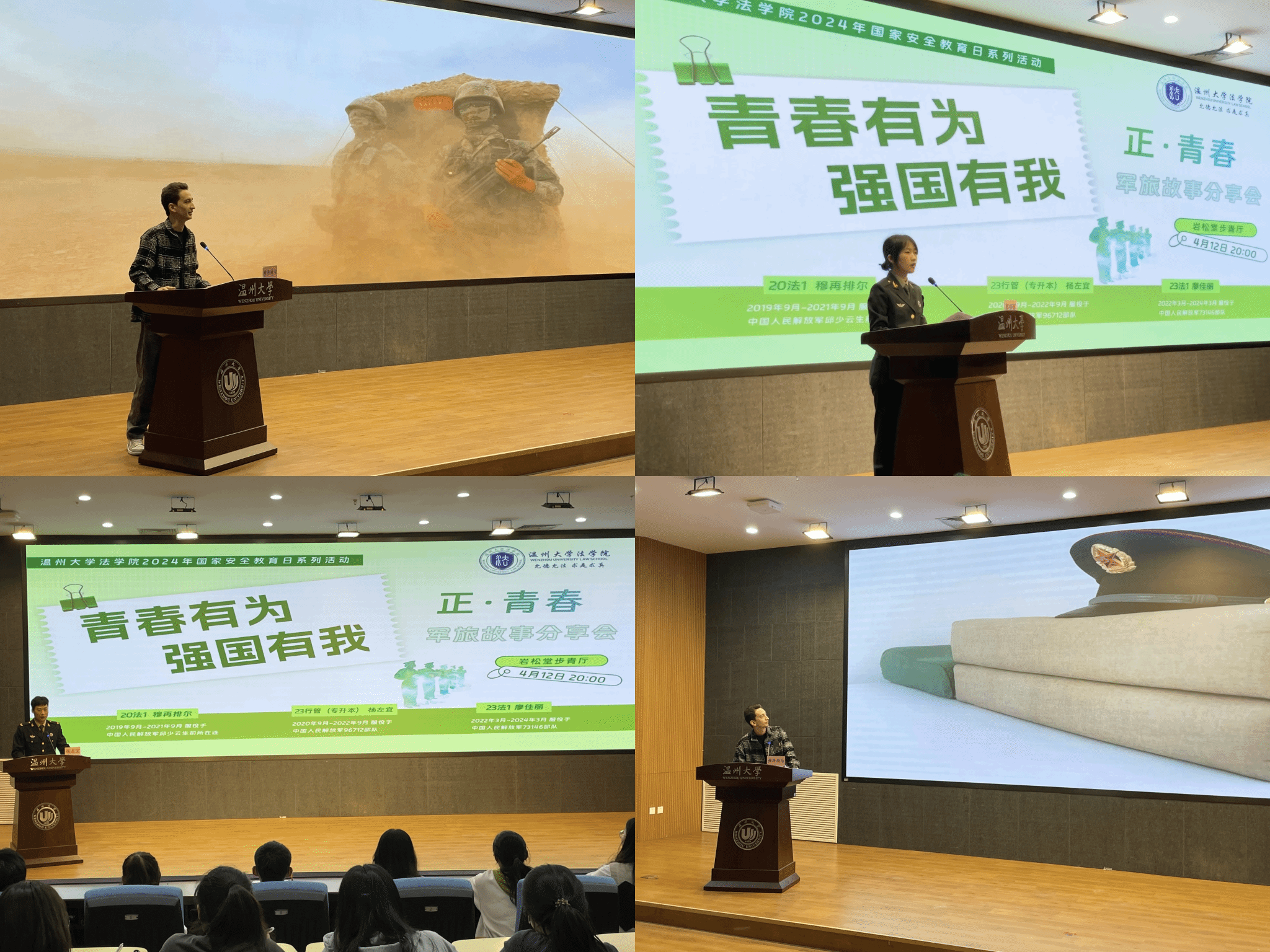 此外,法学院还开展了“青春有为,强国有我”军旅故事分享会,邀请学院退伍学生讲述了他们由一名普通大学生到一名优秀军人的蜕变历程,从不同角度分享了在军队的所见所闻、所思所感、所获所得,用切身经历分享了他们“携笔从戎家国梦,淬炼成钢军旅情”的青春故事,进一步培养了青年学生的家国情怀,切实在学生群体中筑牢维护国家安全的思想防线,强化了保家卫国的责任感和使命感。