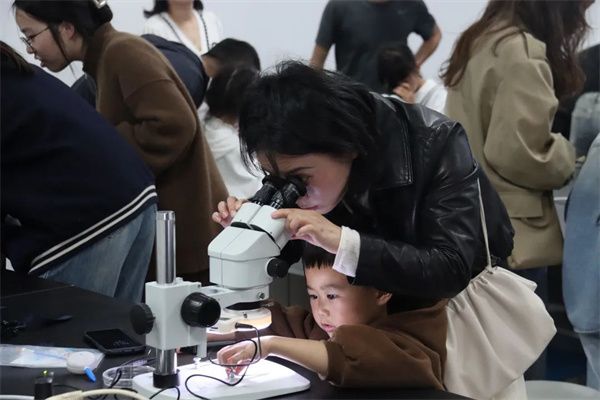 依托温大青少年自然科学科普教育基地,家长和孩子们一起开展科学探究与实践,用心聆听、用心观察,感受生命的奇特律动。星空平台教育学院金建钰博士细心讲解了如何用体视显微镜观察油菜花的花瓣、花萼、雄蕊和雌蕊,小朋友和家长们一同转动目镜、物镜进行观察。透过显微镜看微观世界,孩子们领略了生命的魅力,拓宽了知识面,增强了科学素养,在每一个步骤中都收获了不一样的惊喜。