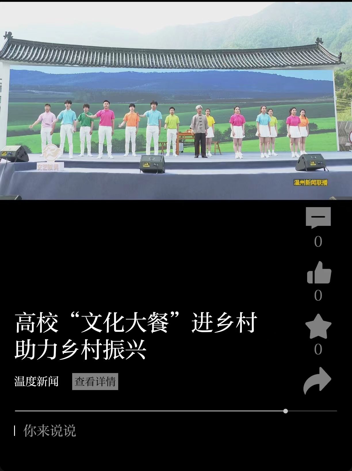 4月11日,全省高校校园原创文化精品巡展巡演首站活动在温州苍南县岱岭畲族乡举行。青春高校与古朴畲乡之间的“双向奔赴”,也为乡村振兴注入新的活力。(图为我校选送作品:教育学院由杨婧、贺捷频、刘婕老师指导的表演唱《粗茶淡饭》)