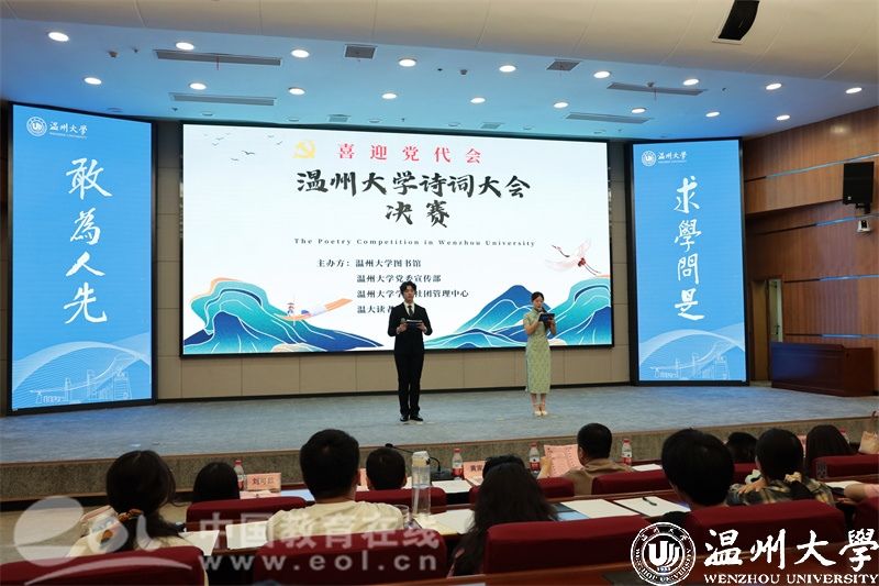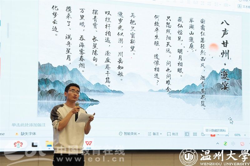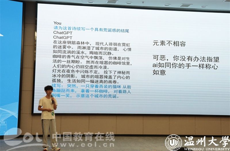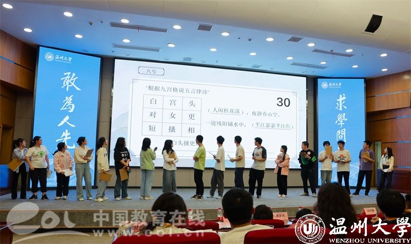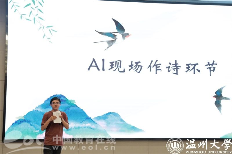 大会分为“原创诗词展示”“AI诗词创作”和“诗词知识竞赛”三个环节,共收到温大各学院近400位学子报名信息,其中AI诗词投稿约占三分之一,作者来自各学科各专业,文理兼具。经过前期线上海选和初赛,3个赛道共40位选手入围决赛。伴随郑东毅同学用AI创作出的古风背景音乐,同学们声情并茂的古诗诵咏吟唱,将大家一键带入优美典雅的诗词氛围里,拉开了比赛的帷幕。