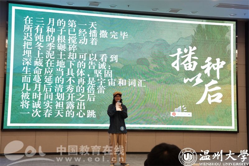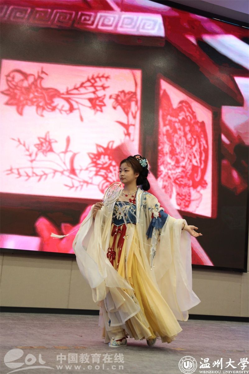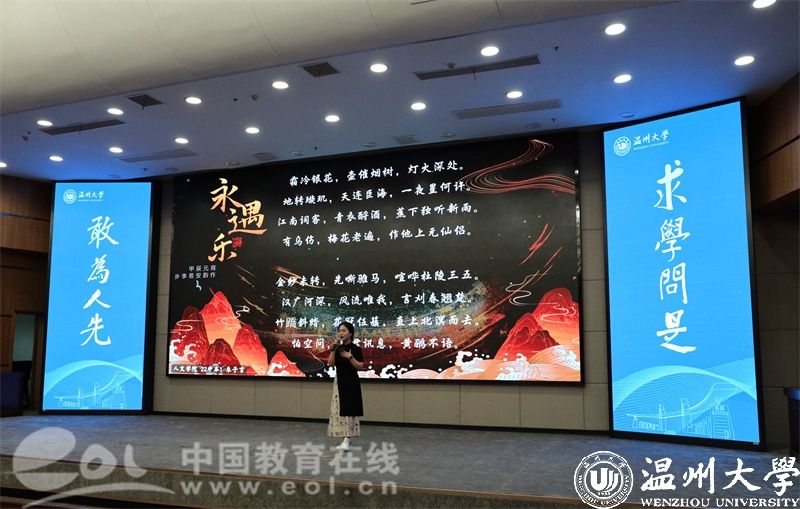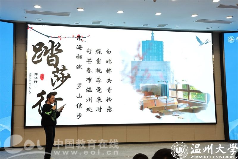 瓯玉汉服社成员为大会带来了精彩美妙的汉服走秀和古典舞,红楼戏曲社成员表演了悠扬婉转的越剧《追鱼·观灯》,流行音乐协会成员高歌一曲《经典咏流传》,让现场观众与传统文化邂逅了一场跨越时空的视觉盛宴,沉醉于国风和诗词的独特魅力中。