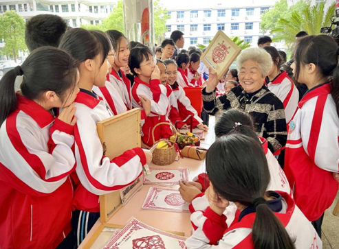 柯娟娥在平阳县鳌江四中西塘校区太平钿剪纸传承教学基地授课,并与学生们开展义卖活动