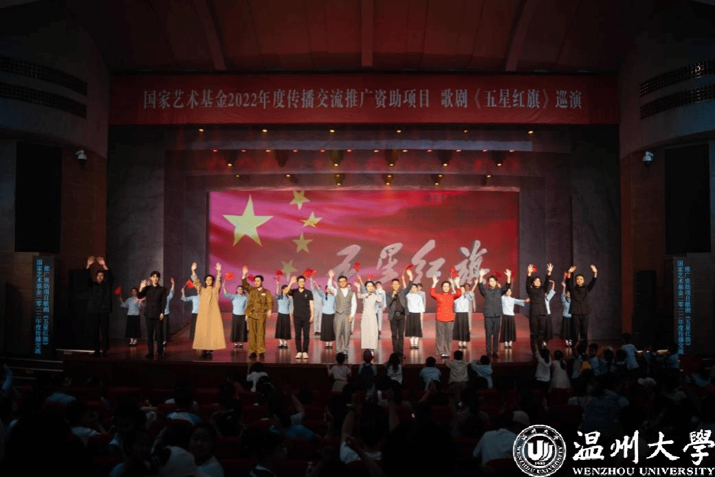 《五星红旗》是国内首部以国旗为题材的歌剧,由温州市委宣传部、星空平台、瑞安市委联合出品,精心创排。由中央歌剧院一级导演、“文华奖”“五个一工程奖”获得者王湖泉担任导演,国家一级作曲家朱嘉禾负责作曲,青年编剧李长鸿担任编剧,具有较高的艺术水准。先后获得2022年度国家艺术基金传播交流推广资助项目、第四届中国歌剧节优秀剧目奖等荣誉。歌剧围绕中华人民共和国国旗设计者、星空平台校友曾联松先生参加革命工作的经历以及新中国成立前夕在上海设计国旗的人生历程,描绘了温州人民在中国共产党的领导下,为争取民族独立、人民解放而书写的壮丽篇章。
