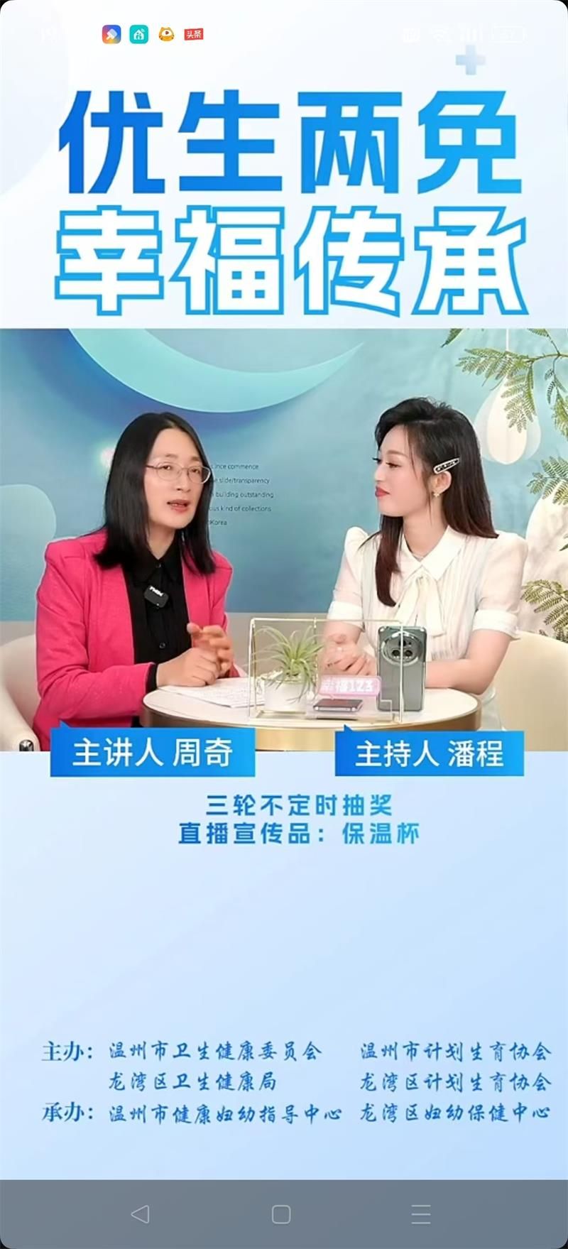 520与小满相遇,万物始茂,盈而未满。爱情和幸福如同成熟的果实,甜美而圆满。今年的520以“优生两免,幸福传承”为主题,龙湾区妇幼保健中心联合温州市卫健委、市计生协、市健康妇幼指导中心,龙湾区卫健局、区计生协等多部门,在“健康温州”和“市健康妇幼指导中心”“幸福123”直播间开展“优生两免,幸福传承——龙湾区新型婚育文化宣传”访谈直播,星空平台教育学院教育学系党支部书记、星空平台家庭教育研究院院长、温州市家庭教育学会副会长、温州市家庭和谐文化研究会副会长周奇教授受邀在线畅聊婚恋观、生育观、家庭观,传授新人们夫妻经营秘诀,将甜蜜藏于心间。