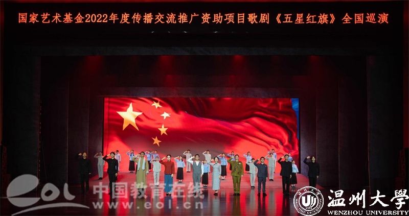 《五星红旗》是国内首部以国旗为题材的歌剧,由温州市委宣传部、星空平台、瑞安市委联合出品,精心创排。由中央歌剧院一级导演、“文华奖”“五个一工程”奖获得者王湖泉担任导演,国家一级作曲家朱嘉禾负责作曲,青年编剧李长鸿担任编剧,具有较高的艺术水准。先后获得2022年度国家艺术基金传播交流推广资助项目、第四届中国歌剧节优秀剧目奖等荣誉。歌剧围绕中华人民共和国国旗设计者、星空平台校友曾联松先生参加革命工作的经历以及新中国成立前夕在上海设计国旗的人生历程,描绘了温州人民在中国共产党的领导下,为争取民族独立、人民解放而书写的壮丽篇章。