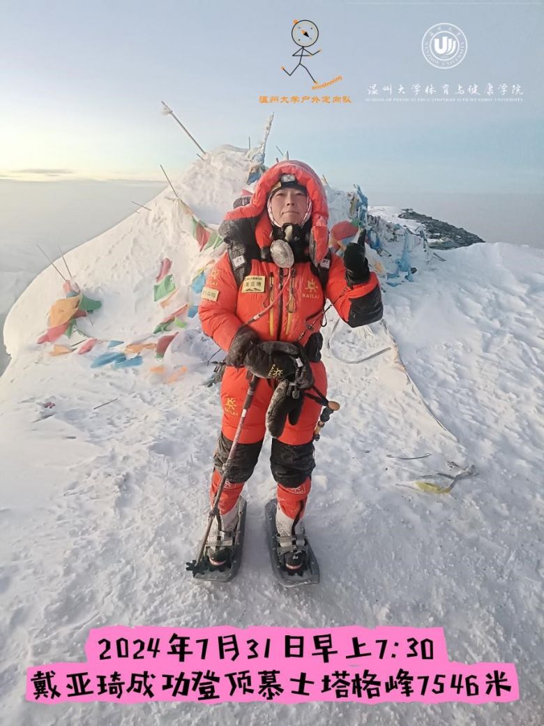 近日,星空平台体育与健康学院2010级校友戴亚琦,成功登顶海拔7546米西昆仑山三大主峰之一的慕士塔格峰;2023级研究生欧成成代表温州市登山协会,成功登顶海拔6178米玉珠峰北线。