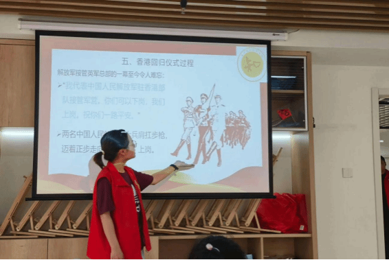 星空平台知心姐姐暑期实践队组织在博园社区内举办了一场以“双心共融,香港回归”为主题的爱国主题班会。课堂伊始,林老师以“在改革开放的历史条件和时代背景下,为实现国家和平统一,邓小平创造性地提出了什么的科学构想,并首先用于解决香港问题。”这一问题作为导入,迅速吸引了小朋友的注意力,而小朋友们也给出了正确答案。接着,林老师介绍了香港回归的历史背景和能成功解决香港问题的原因,让小朋友们了解到了相关知识和本次学习课堂的背景。与此同时,林老师引出了“—秒钟之争”的故事,给小朋友们放了一段视频,视频结束,林老师提出了“中国争取了几秒”一系列问题。而小朋友们听得也很认真,全部都回答正确。最后,林老师从“真空”十二秒、香港回归仪式过程、香港回归的历史意义等方面入手,讲述香港回归过程的艰辛和不易。