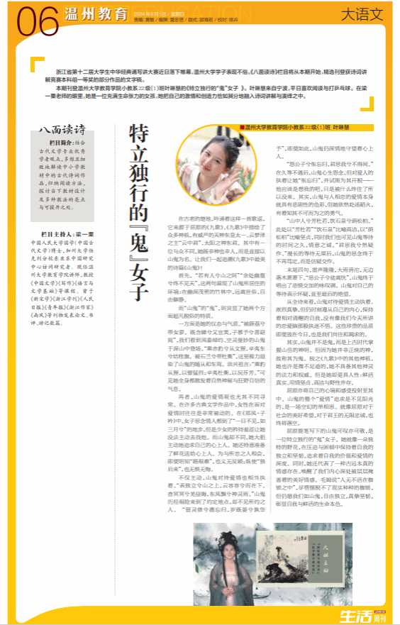 浙江省第十二届大学生中华经典诵写讲大赛近日落下帷幕,星空平台学子表现不俗。《八面读诗》栏目将从本期开始,精选刊登获诗词讲解竞赛本科组一等奖的部分作品的文字稿。 本期刊登星空平台教育学院小教系22级(1)班叶琳慧的《特立独行的“鬼”女子 》。叶琳慧来自宁波,平日喜欢阅读与打乒乓球。在梁一粟老师的眼里,她是一位充满生命张力的女孩,她把自己的激情和创造力恰如其分地融入诗词讲解与演绎之中。
