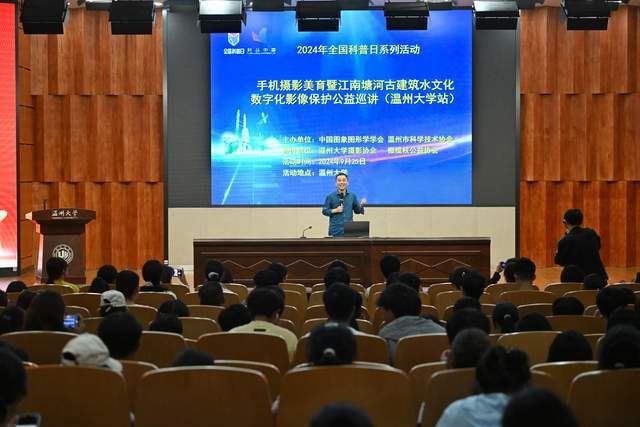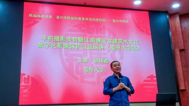 胡铸鑫以其丰富的摄影经历和独到的见解,向在场同学详细讲解了手机摄影知识的技巧和美学,还依托他自2012年开始带领的暑期大学生社会实践活动中积累的经验与成果,展示塘河古建筑的数字化影像。“温瑞塘河作为温州的城市命脉,承载了世代温州人的记忆,而摄影则成为了一种记录和保护这一文化瑰宝的有效方式。通过手机摄影,我们可以将江南塘河的故事和文化魅力传递给更多的人。”