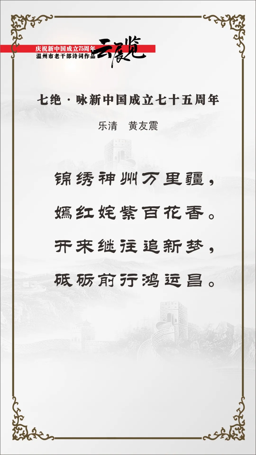 翰墨书盛世,丹青绘风华。为喜迎中华人民共和国75周年华诞,温州市委老干部局举办庆祝新中国成立75周年温州市老干部主题作品云展览。本次云展览将分批展出老同志的诗词、书画、摄影、篆刻、剪纸等作品约180幅,其作品内容积极向上,艺术趣味高雅,形式丰富多彩,充分展现出推进强国建设、民族复兴伟业的壮美华章,有力表达了温州老干部礼赞新中国、奋进新时代的美好祝愿。