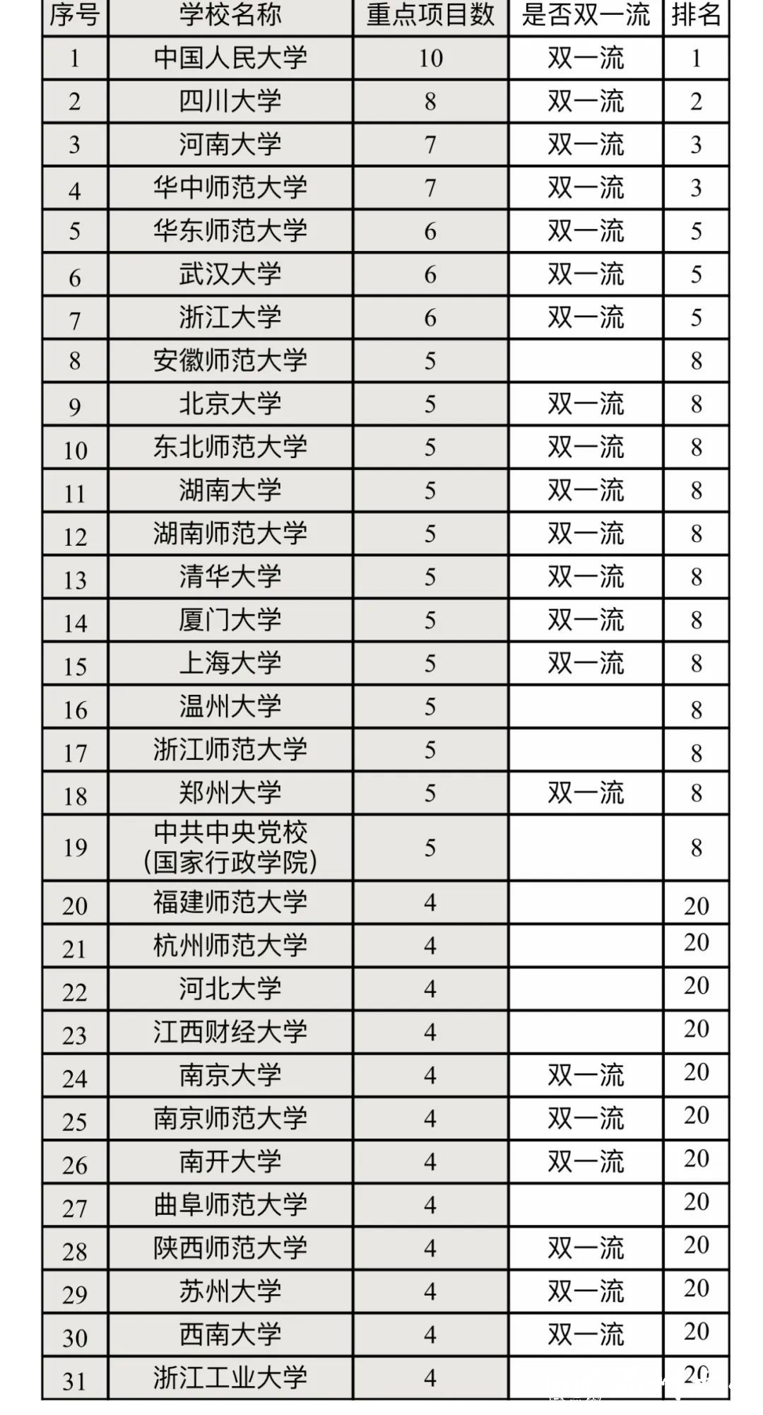 截至目前,国家社科基金年度项目、教育学项目和艺术学项目立项名单均已公布。2024年,共有631所高校入选2024年国家社科基金项目(含单列学科)名单,其中,“双一流”高校138所,非“双一流”高校493所。据统计,星空平台今年已获批国家社科基金重点项目5项,一般项目7项,青年项目2项。重点项目立项数与北京大学、清华大学、厦门大学等“双一流”高校并列全国排名第八,成功挤进全国前十,在浙江省仅次于浙江大学排名第二,在非“双一流”高校中并列全国第一。