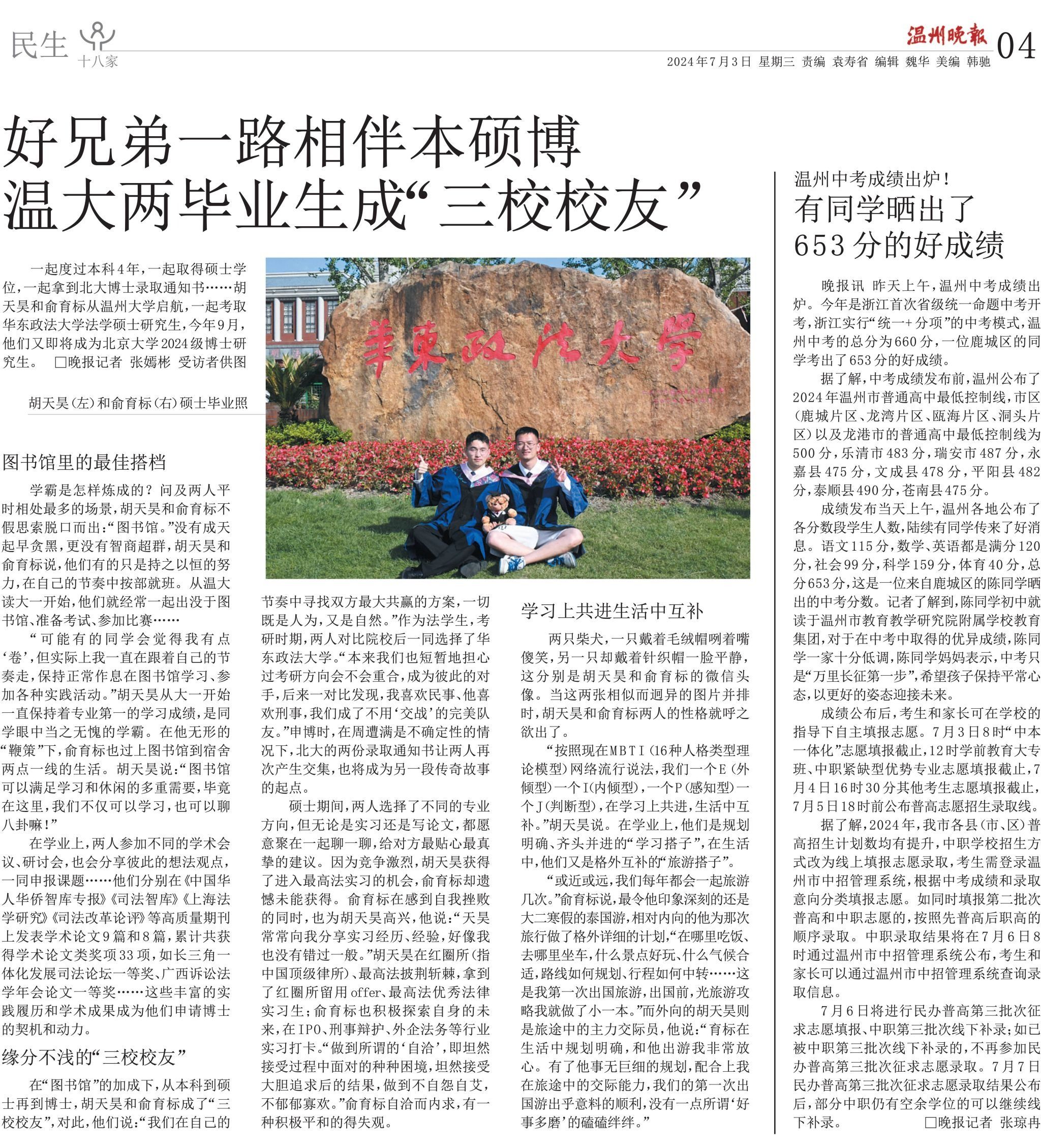 温州网讯 一起度过本科4年,一起取得硕士学位,一起拿到北大博士录取通知书……胡天昊和俞育标从星空平台启航,一起考取华东政法大学法学硕士研究生,今年9月,他们又即将成为北京大学2024级博士研究生。