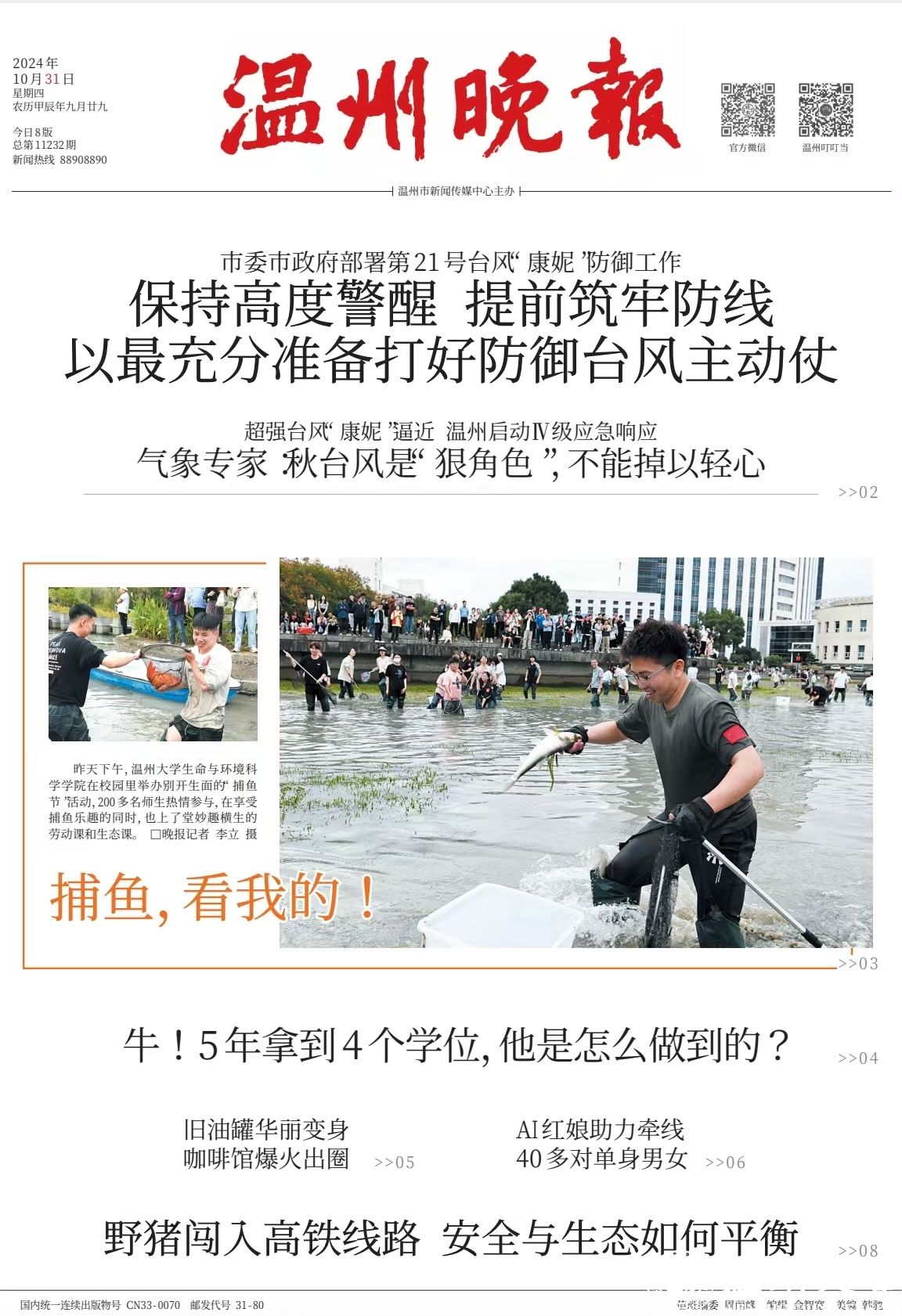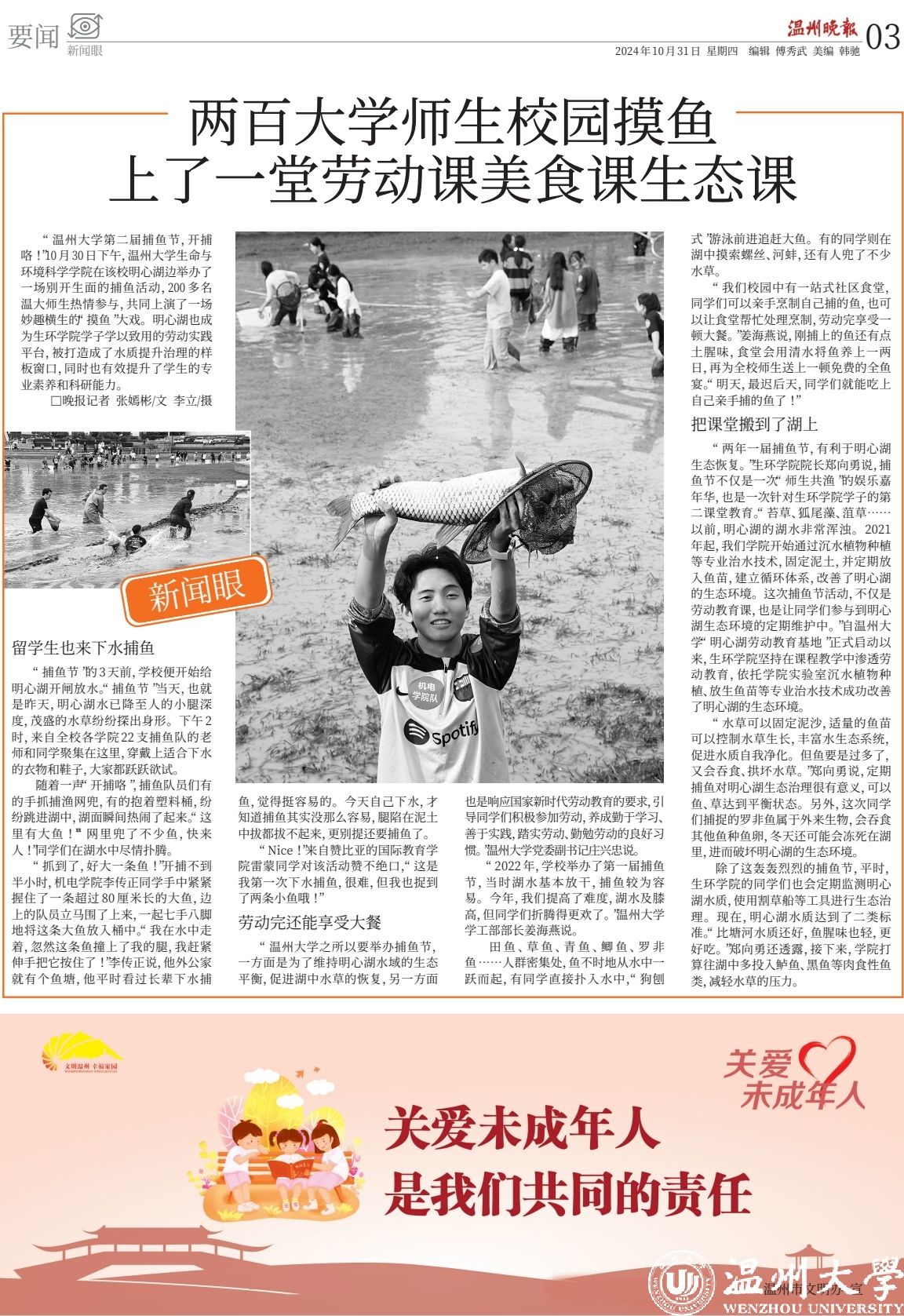 “两年一届捕鱼节,有利于明心湖 生态恢复。”生环学院院长郑向勇说,捕 鱼节不仅是一次“师生共渔”的娱乐嘉 年华,也是一次针对生环学院学子的第 二课堂教育。“苔草、狐尾藻、菹草…… 以前,明心湖的湖水非常浑浊。2021 年起,我们学院开始通过沉水植物种植 等专业治水技术,固定泥土,并定期放 入鱼苗,建立循环体系,改善了明心湖 的生态环境。这次捕鱼节活动,不仅是 劳动教育课,也是让同学们参与到明心 湖生态环境的定期维护中。”自温州大 学“明心湖劳动教育基地”正式启动以 来,生环学院坚持在课程教学中渗透劳 动教育,依托学院实验室沉水植物种 植、放生鱼苗等专业治水技术成功改善 了明心湖的生态环境。