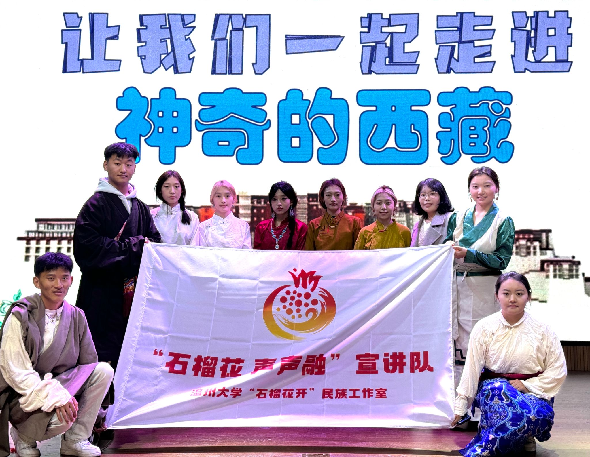 高大的雪山、清澈的湖泊、广袤的草原、耗牛点点、草甸如毡也如画卷,一一在孩子们的眼前展开。美丽的自然环境孕育了独特的藏区文化,展演开始,“石榴花·声声融”宣讲队的同学们携小朋友们一起走进大美西藏。他们以身着的藏区服饰为例子,分别介绍了那曲、林芝等各地风格各异的服饰、饰品以及其蕴含的巧思。